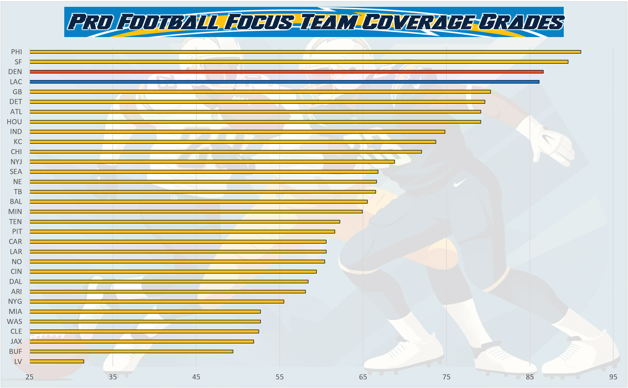 The Chargers’ secondary has been brilliant this season—almost as much as their excellent counterparts. They rank fourth, behind the Broncos, 49ers, and Eagles.