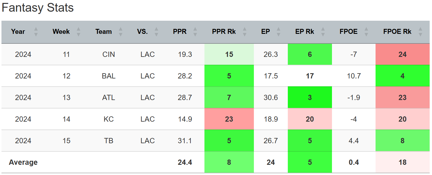 The Chargers can be run on. They rank 11th in EPA per rush allowed and 18th in defensive success rate on rushes. In their last five games, they have allowed the eighth-most fantasy points to opposing RBs.