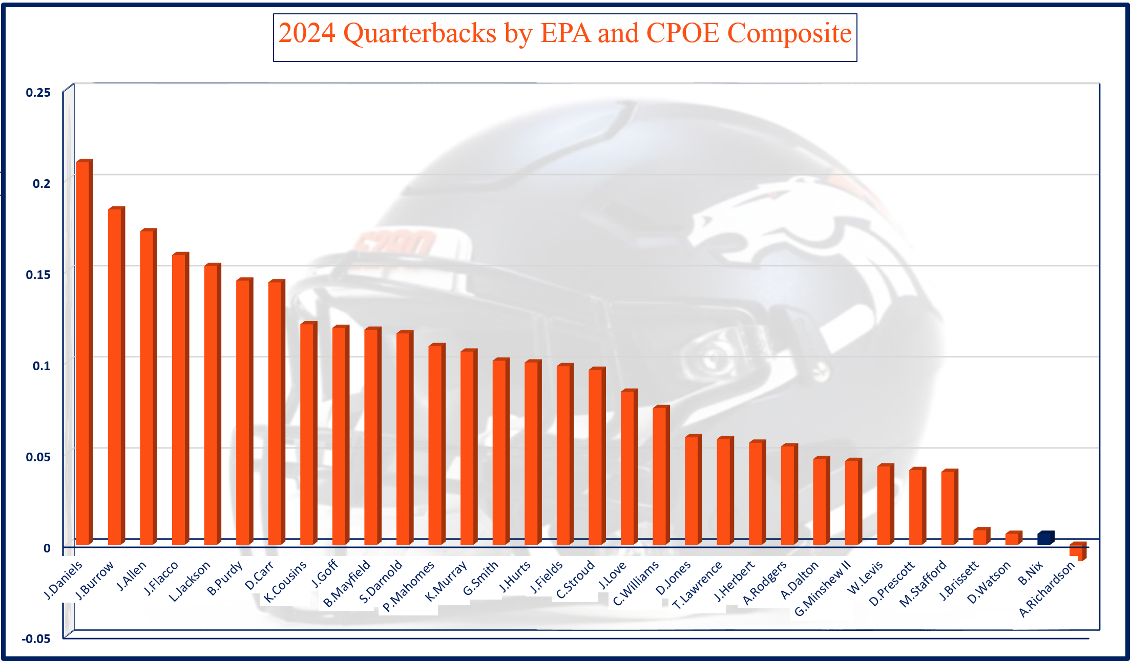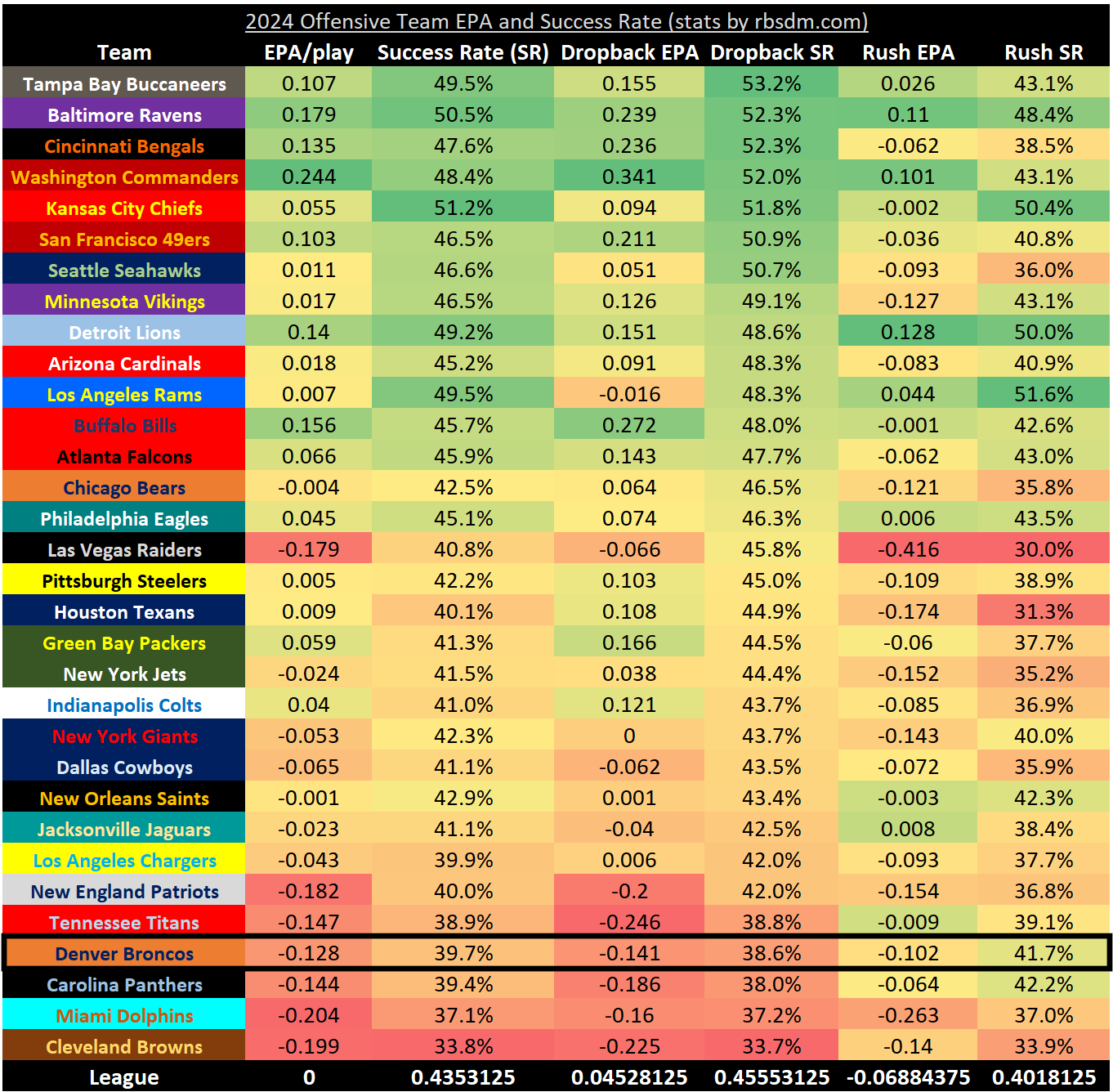 The Broncos enter Week 7 ranked 26th in EPA per play and 28th in offensive success rate. They are 27th in EPA per dropback and 28th in offensive success rate on dropbacks.