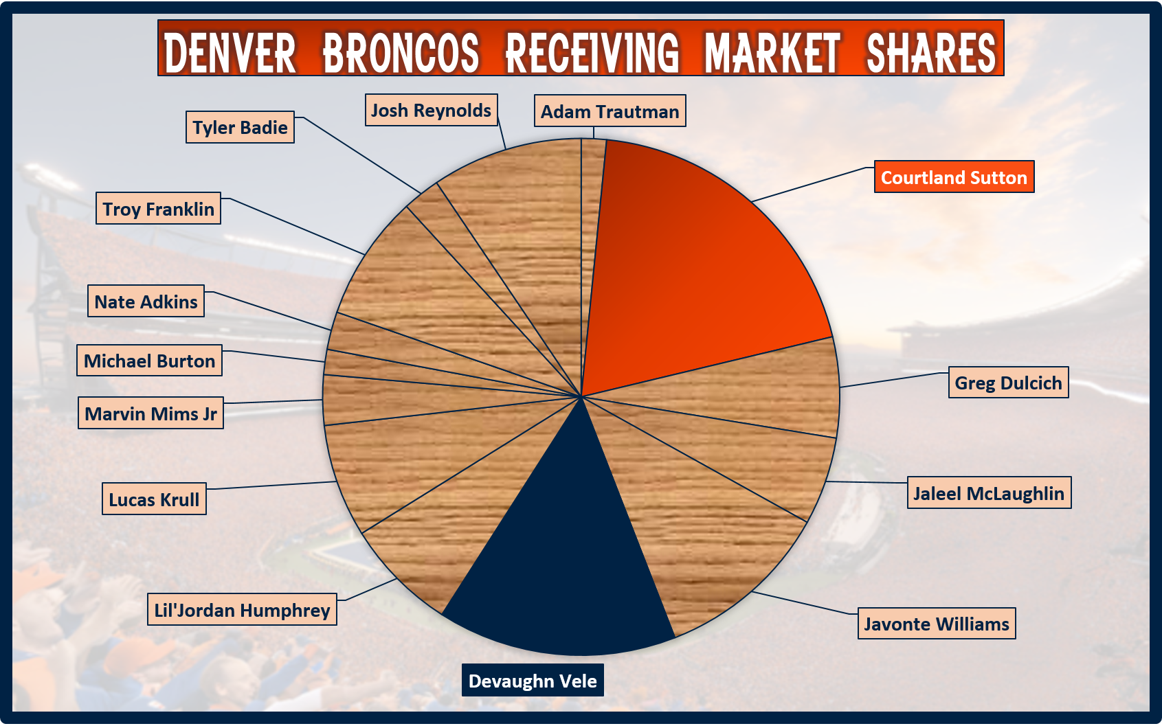 The Broncos don't have the narrowest distribution of targets. Courtland Sutton leads the way with a 25% market share. The only other receiving option in the neighborhood of 20% is Devaughn Vele. Almost no one is efficient with that opportunity, as only Vele and Josh Reynolds have positive FPOE on at least ten targets.