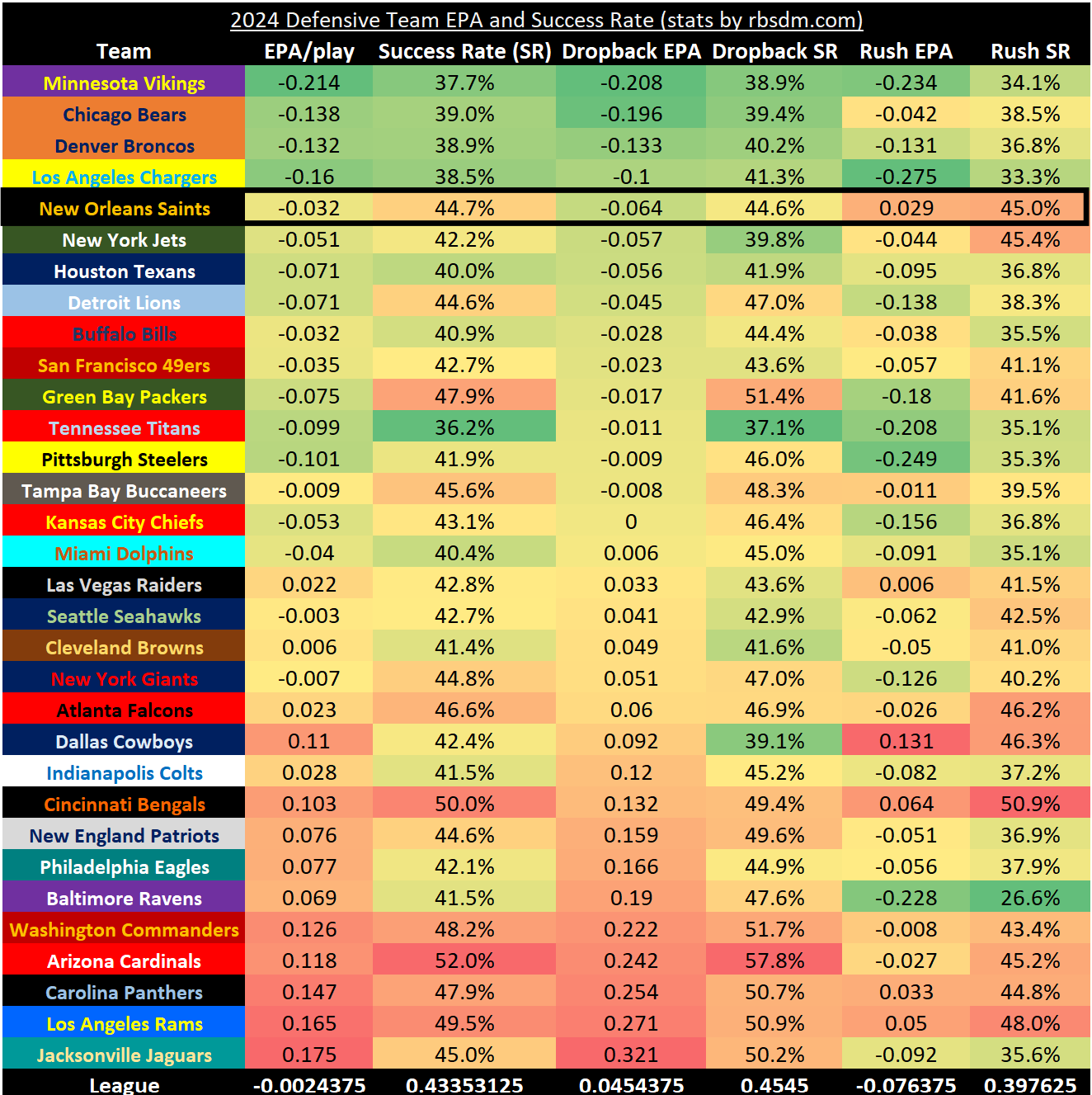 The Saints, who also initially appeared to have a good defense, are now dead-smack in the middle at 15th in EPA per play. However, they have been far better against the pass; they rank fifth in EPA per dropback allowed.