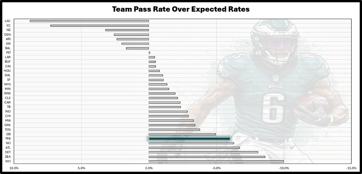 Philadelphia has a reputation for running the ball incessantly. After leading the NFL in run rate a year ago (55%), they entered last week’s game against Denver with the highest rate again (54%), including from a neutral game script (56%). Perhaps it was the grumblings from their star WRs leading up to last week’s game; maybe it was the fans’ wishcasting. Whatever the impetus, the Eagles came out with an entirely different approach Sunday, throwing at a 79% rate from a neutral script (T-2nd).
