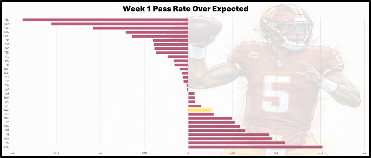 The Commanders were more effective running the ball, but they opted to pass. Washington ranked 10th in pass rate over expected (PROE). They were relatively aggressive as well, ranking seventh in team aDOT.