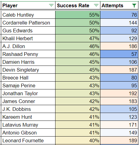 Below I profile the RBs who finished with a success rate of 40%+ last season on less than 200 attempts.