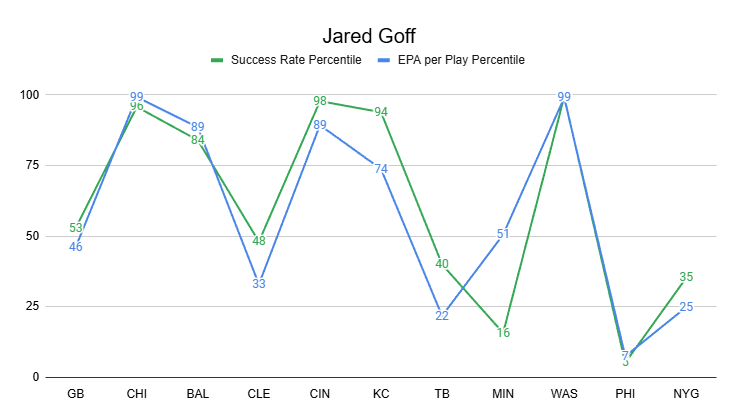 Even after a couple of down weeks, Goff still ranks a respectable QB14 in EPA per game and QB11 in success rate.