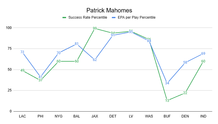 Then, Rice returned, and Mahomes jumped to QB6 in Weeks 7-8, posting two of his three most efficient games of the year overall.