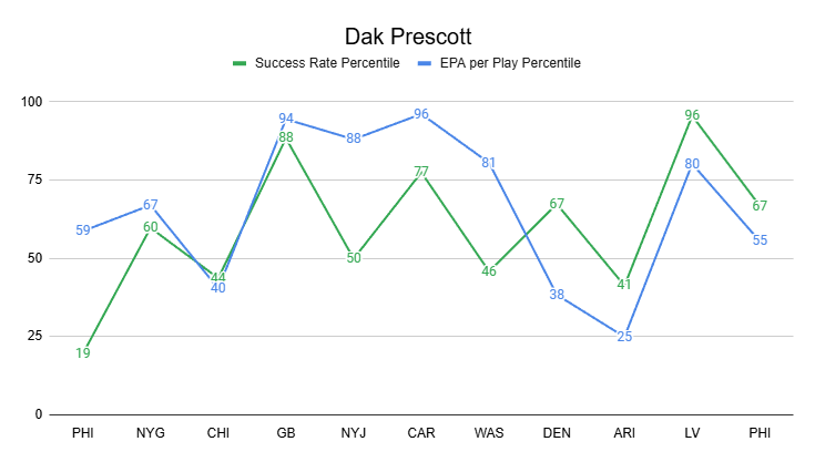 Prescott's weapons have helped him rebound strongly from a down 2024, not just on his first look, but overall. He ranks QB5 in EPA per game and QB13 in success rate.