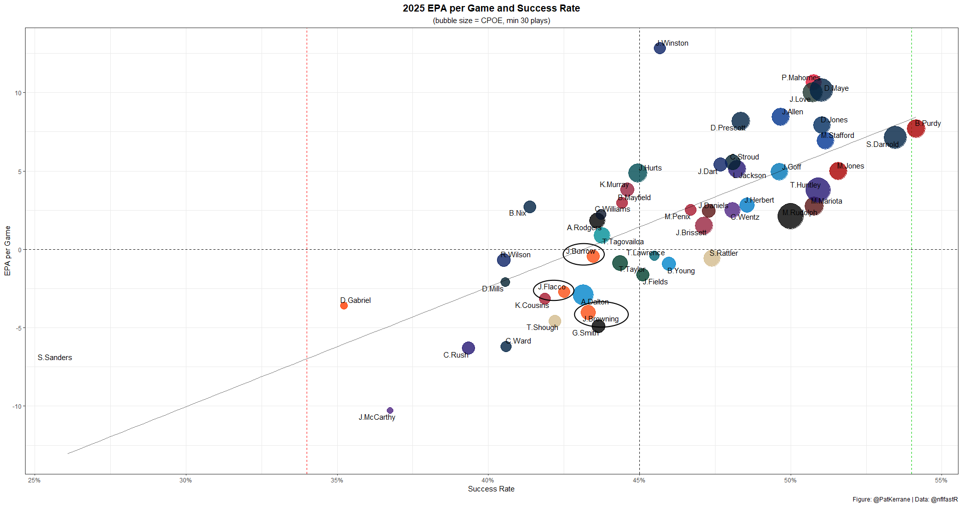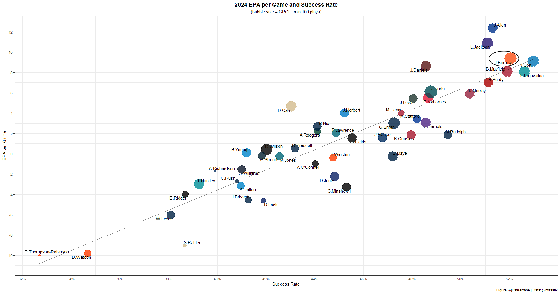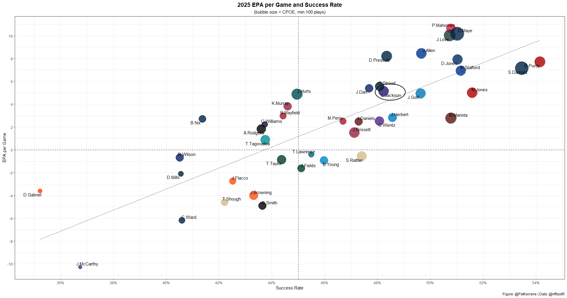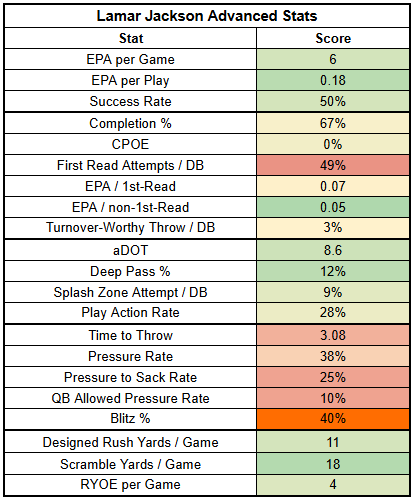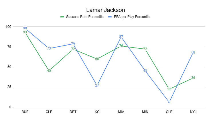 Likewise, Jackson hasn't been bad this year; he just hasn't been the force of nature we've come to expect. Jackson ranks a respectable QB12 in EPA per game and QB14 in success rate.