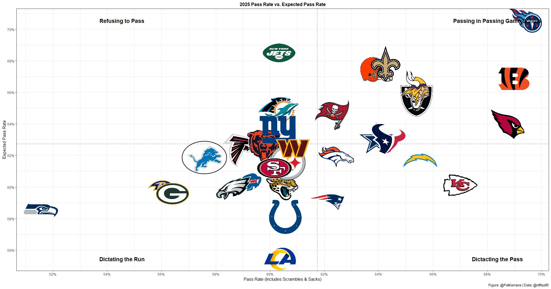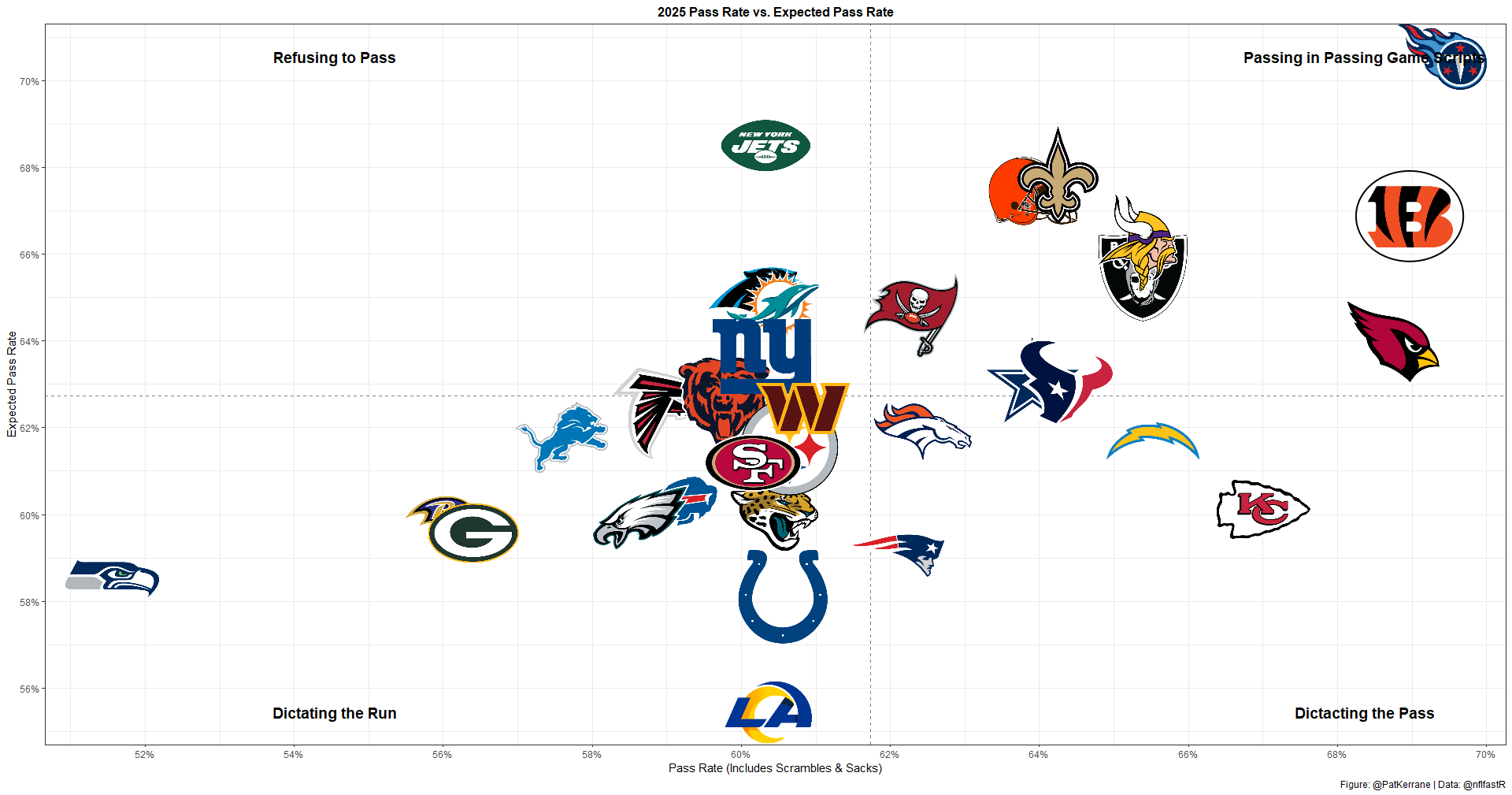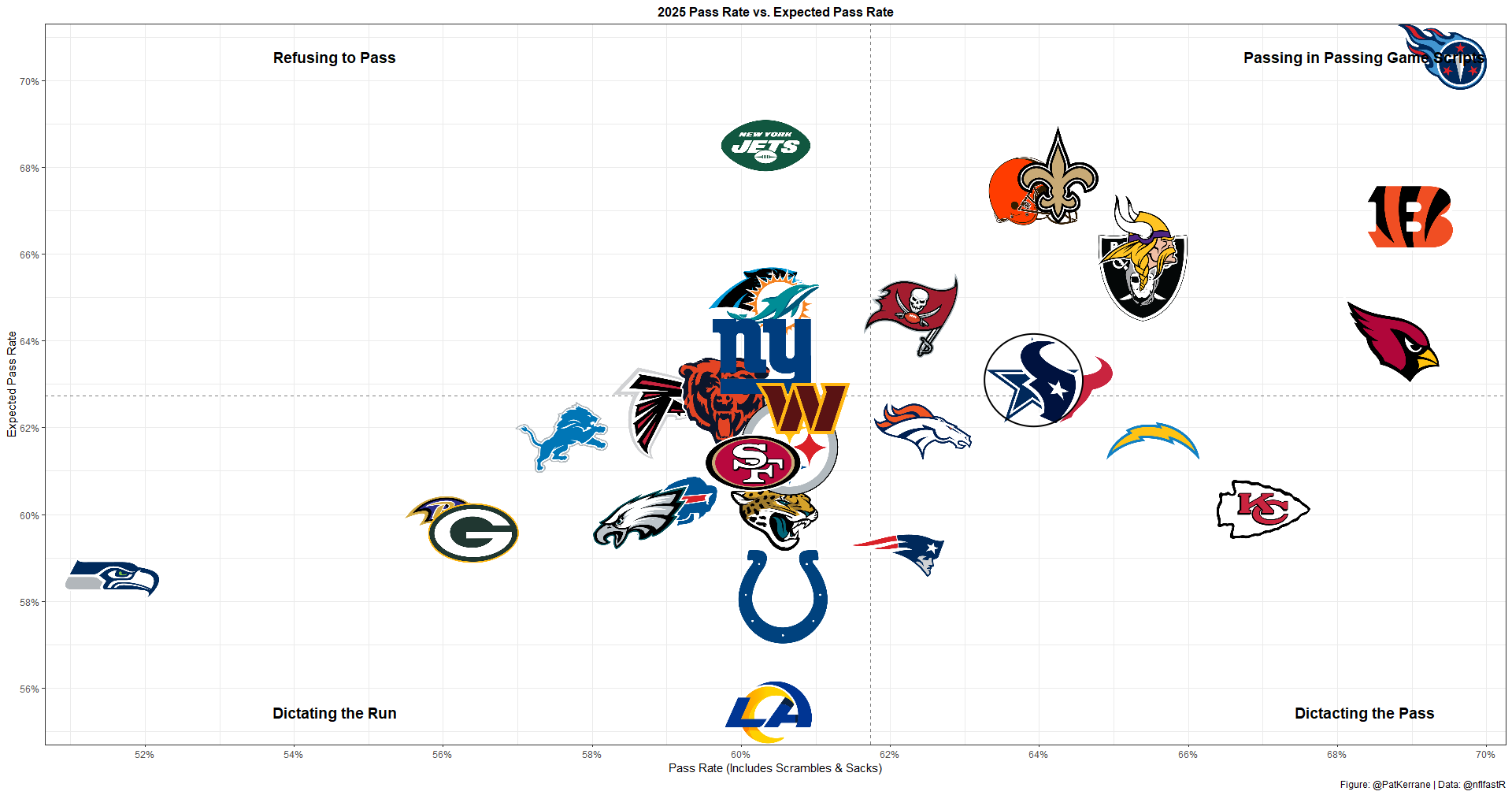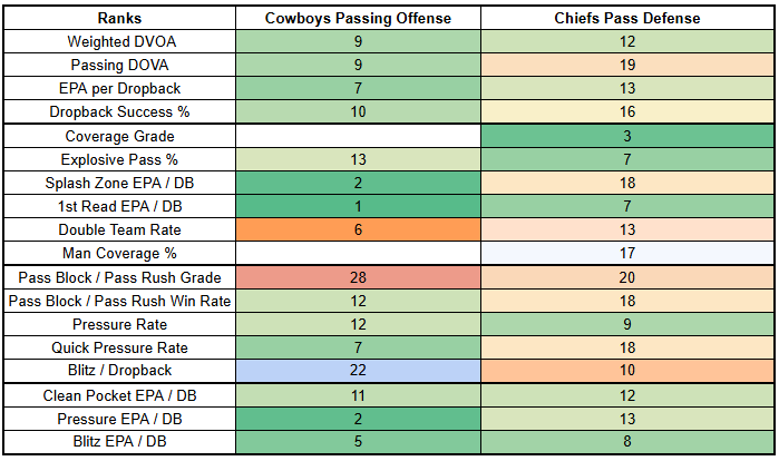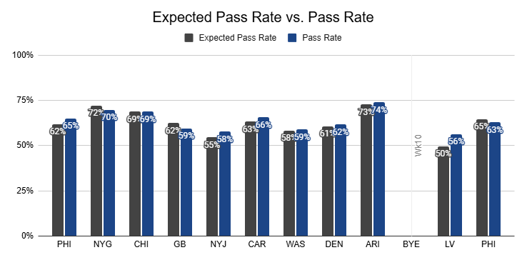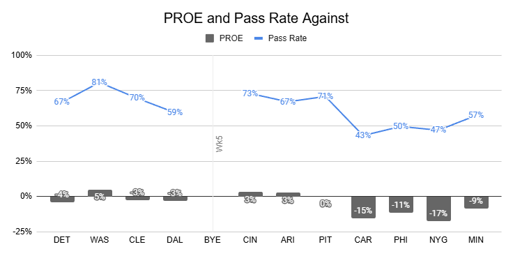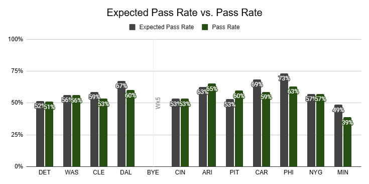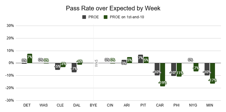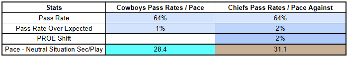 With a 1% PROE and 64% pass rate, the Cowboys aren't pass-heavy. But they're also very comfortable in high-pass-rate environments.