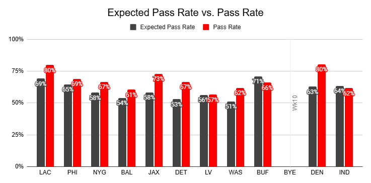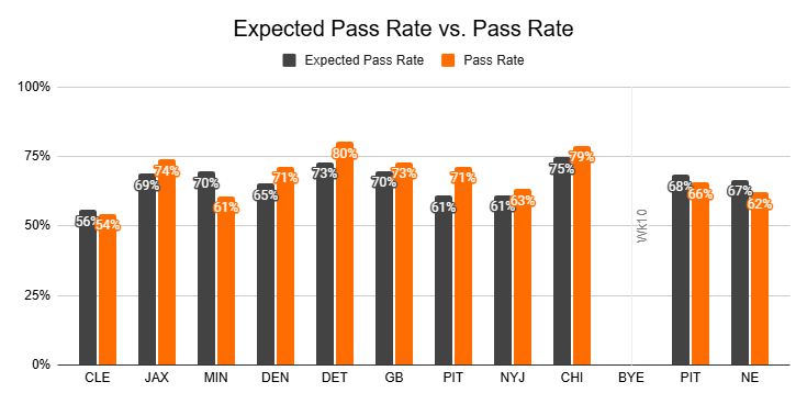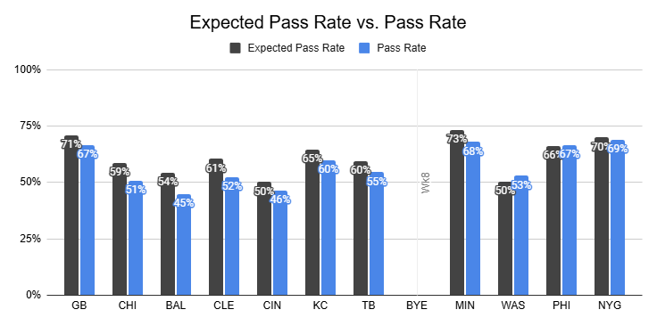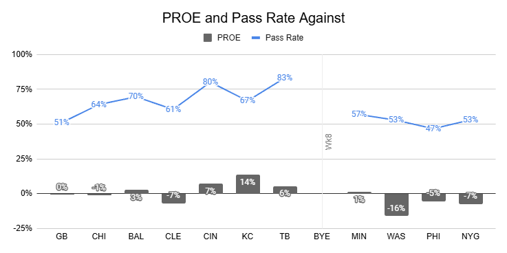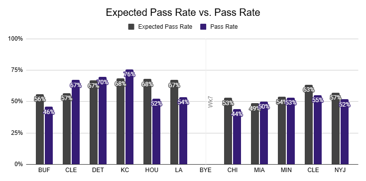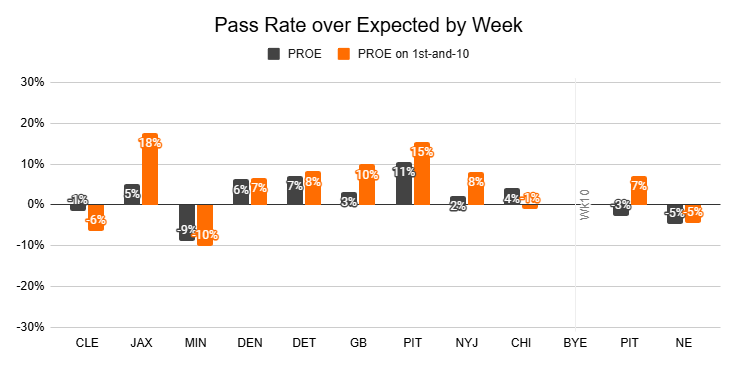 Since Jackson's Week 9 return against the Dolphins, the Ravens have peaked at just a 55% pass rate, delivering negative PROEs over the last two weeks to get there.