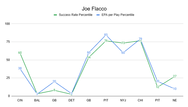 The Bengals' defense is bad enough that, even with PROEs of -3% and -5% over the last two weeks, the Bengals still posted pass rates of 66% and 62%. This puts them at a league-average pass rate or above in ever game with Flacco.