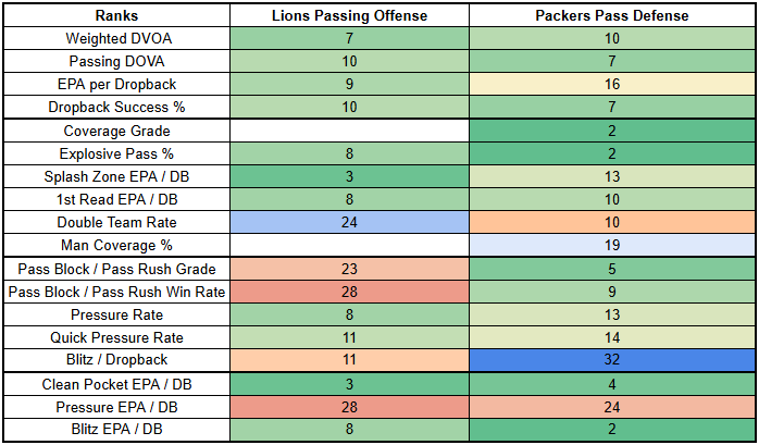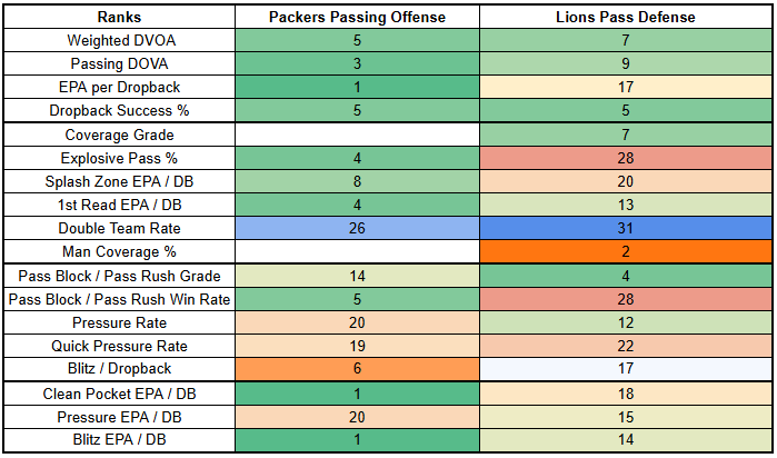 The Lions aren't a bad pass defense overall. But, especially if the Packers can get the run game going, Green Bay should be able to take shots downfield effectively. The Lions rank sixth-worst in preventing explosive plays.