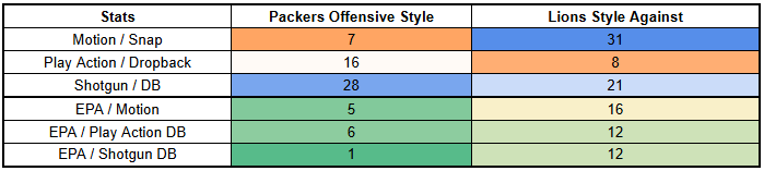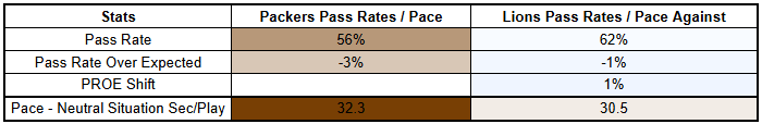 The Packers are also a very effective play action team, and teams are utilizing play action against the Lions at a high rate. The ability to deploy play action against this defense will likely reinforce the Packers' typical mode of operation here.