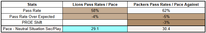 The Packers now get a Lions defense that some opponents have been pass-heavy against, but playing Detroit doesn't really require a pass-first approach. In fact, the Giants were just run-heavy against them in an overtime loss, and the Eagles were very run-heavy in a win.