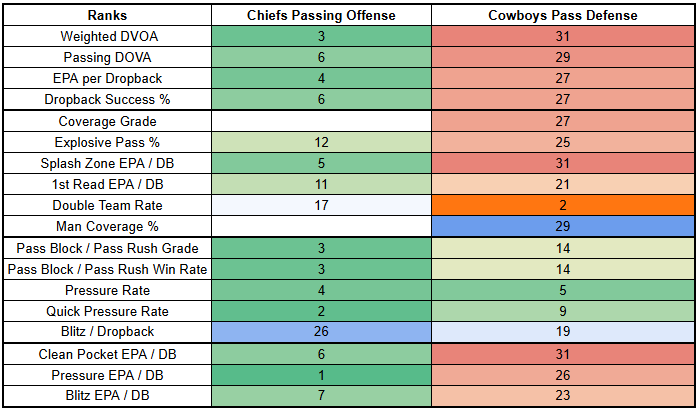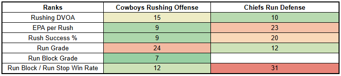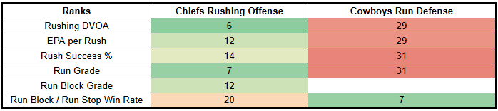 Over the last three games, the Chiefs have faced zone coverage rates of 63%, 71%, and 53%. The Cowboys have a 79% zone coverage rate this year, and are at 89% since their Week 10 bye.