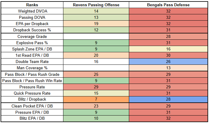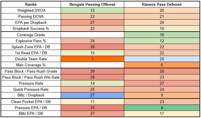 The Ravens are much stronger in coverage than in generating pressure. But they don't double-cover at a very high rate, which is good news for Ja'Marr Chase, who will, very obviously, operate as the focal point this week with Tee Higgins out.