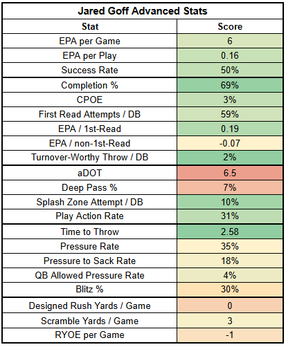 Goff has a 2.58-second time to throw. Only Tua Tagovailoa (2.46) is faster. And on first-read dropbacks, Goff ranks QB8 in EPA per dropback. However, on non-first-read dropbacks, Goff ranks QB18. Goff isn't really a playmaker; he's out there trying to execute the offense within structure. That, of course, is not breaking news. This is Goff's 10th season; we're all pretty familiar with his game.