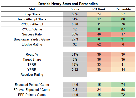 Derrick Henry scored two TDs against the Jets, but he still had a bit of an underwhelming rushing day, turning 21 carries into just 64 yards with -6 RYOE and a very weak 14% success rate.