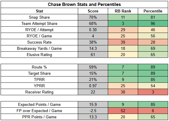 Brown hasn't been very efficient this year. The Bengals are willing to trust him when they don't have anyone else they can trust... but with Perine back, he looks far less interesting in a D'Andre Swift-style starting role than as an every-down back.