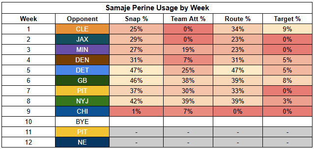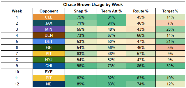 In the backfield, Samaje Perine is off the injury report and will return, which will impact Chase Brown's workload. Brown has been dominating touches since Perine was hurt, but Perine was siphoning off valuable work prior to Week 9.