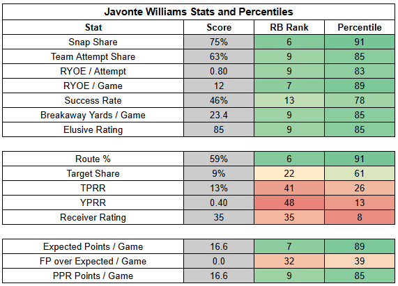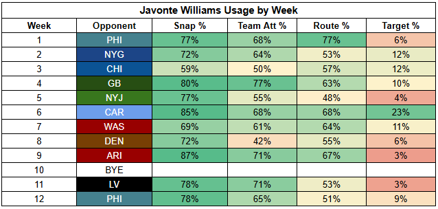 In the backfield, Javonte Williams continues to dominate touches.