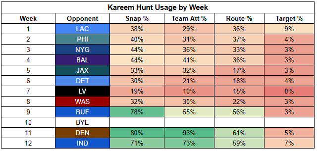 Kareem Hunt has been a much better short-yardage runner and is delivering an elite success rate. Hunt is my preferred play here even with Pachco back, but he's just an RB4 as a bet on a TD.