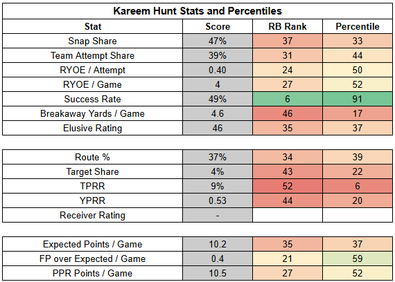 But this matchup still sets Rice up for a very strong day—a potential return to the pace he initially set after his return from suspension. Because even with Mahomes not operating at peak efficiency over the last three games, the Chiefs have still been passing at a high rate. Last week, they posted a negative PROE, but still turned in a league-average pass rate. If Mahomes returns to form here and/or the Cowboys push the Chiefs... we could be looking at a rare combination of volume and efficiency.