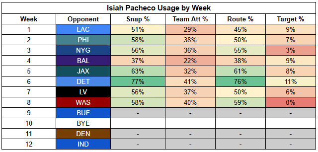 Against a Cowboys run defense that isn't good... but is better since the addition of Quinnen Williams, Pacheco is also in the RB4 mix.