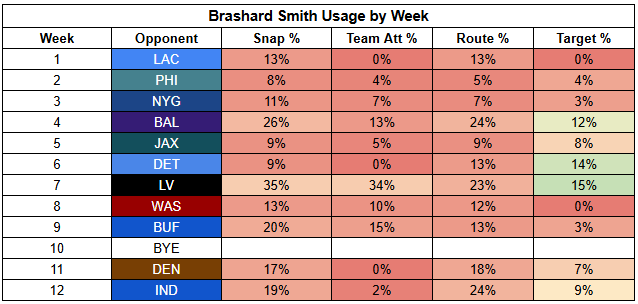 One issue for Worthy and Kelce is that the passing game is pretty spread out. Rice is generally able to consolidate targets, but Worthy and Kelce are dealing with Hollywood Brown, Tyquan Thornton, and Juju Smith-Schuster, all of whom are continuing to mix in. Individually, all three are very shaky plays; collectively, they lower the floor for the Chiefs' top three receivers.