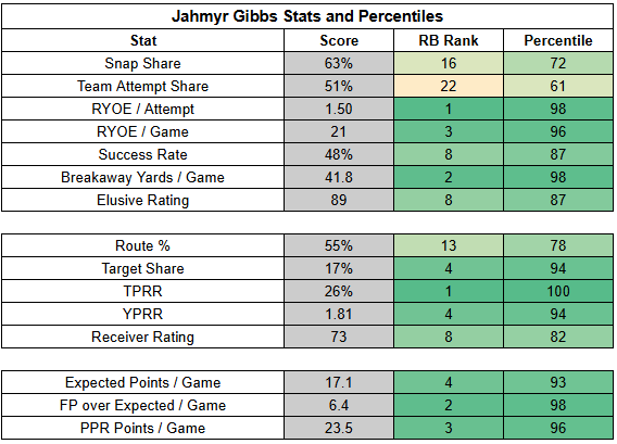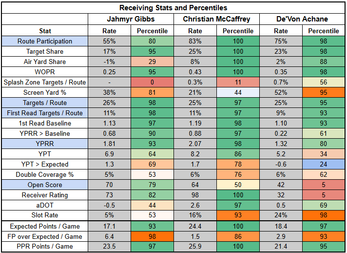 If we think of Gibbs purely as a receiving running back, his per-route profile is on par with Christian McCaffrey's and much stronger than De'Von Achane's. In this matchup, we're likely to see the Lions lean on Gibbs in the receiving game once again.