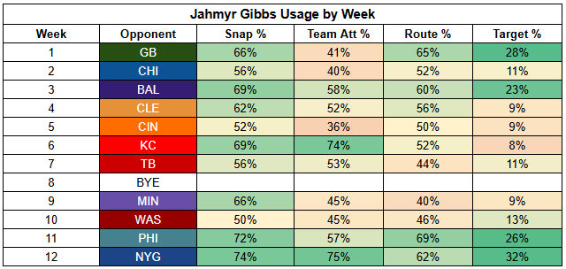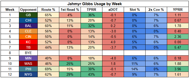 This has changed massively under Dan Campbell. Arguably, it's the biggest change we've seen since he's taken over play calling. Gibbs has posted his three highest first-read target rates of the year over the last three weeks, including elite rates in his massive spike weeks against the Commanders and Giants.