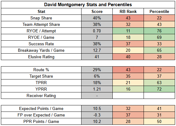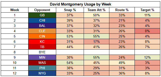 In all likelihood, we'll see Montgomery get more work than he did last week. I highly doubt the plan was for him to have just eight touches last week. We'll likely see him more in the 40% carry share range.