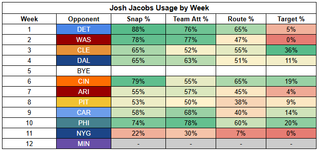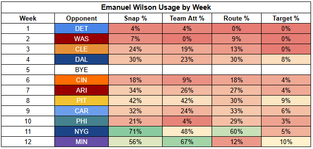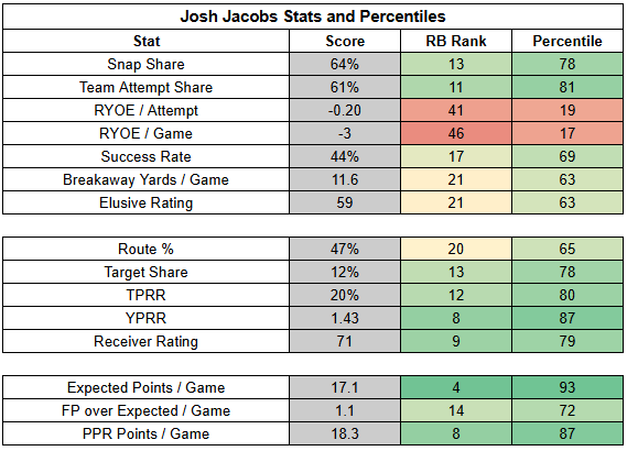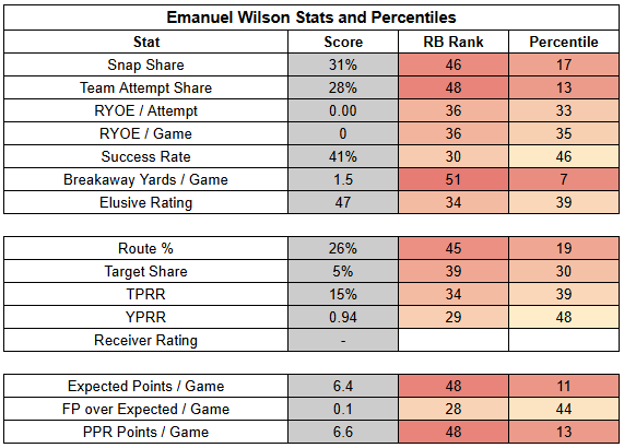 Emanuel Wilson filled in admirably for Jacobs last week, posting 26.5 PPR points, scoring two TDs, and posting 30 RYOE with a 46% success rate. But Wilson's production was also a product of volume. He rushed 28 times and recorded 30 touches. That volume was supported by a ton of positive game script for the Packers. Wilson didn't even have to dominate carries to touch the ball 30 times.