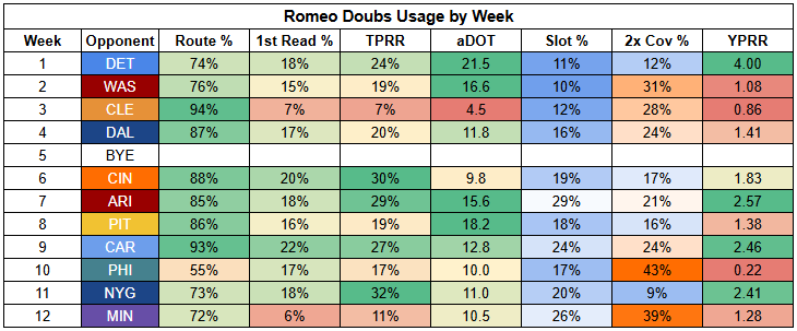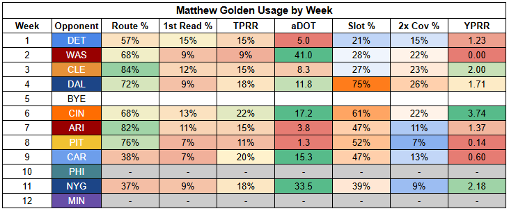 With pass volume potentially limited this week, Romeo Doubs' declining route participation isn't a great sign.