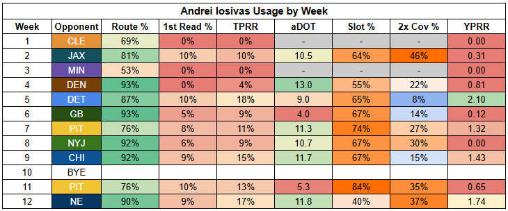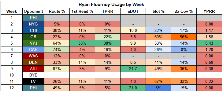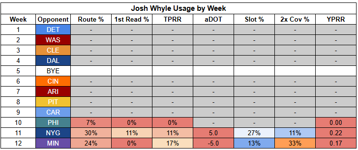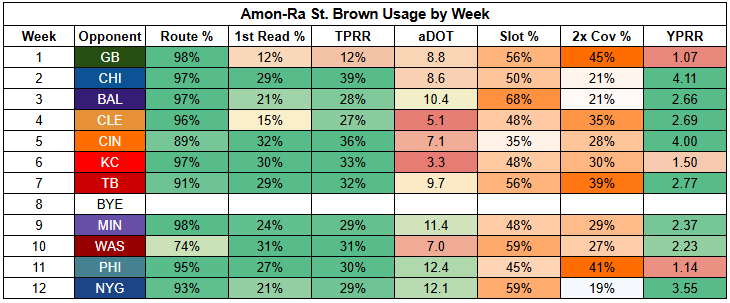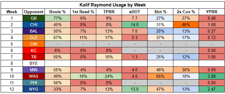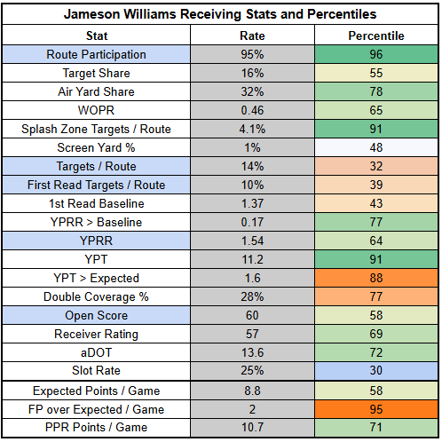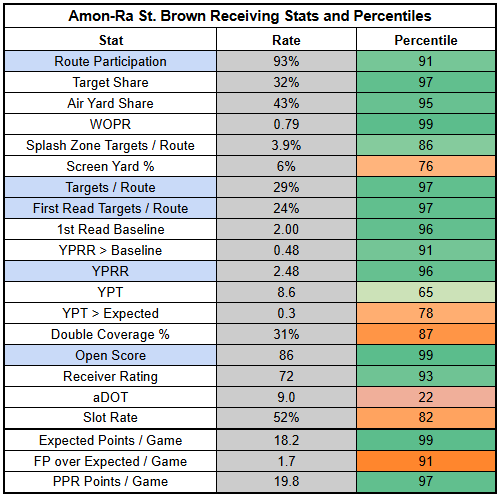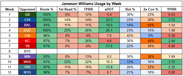 The silver lining here is that Williams turned in a 4/88/1 receiving line against the Eagles, with 2.32 YPRR, in a game where St. Brown was held to just 2/42/0.