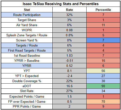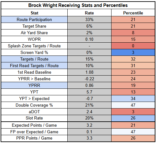 With a career TPRR of 11% and a career YPRR of 1.03, he's likely to be pretty Brock Wright-esque, if not worse.