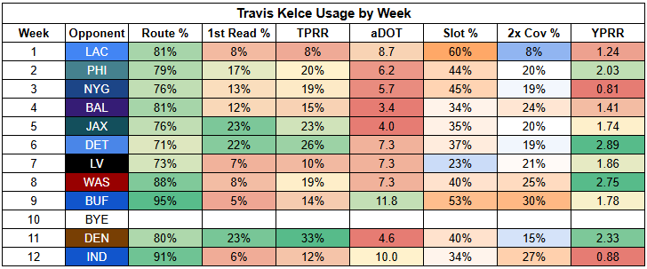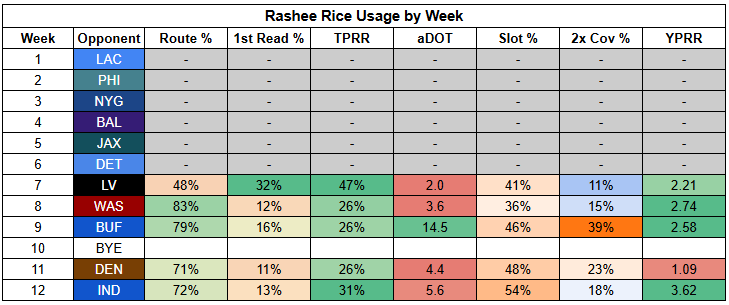 Travis Kelce posted a 33% TPRR against the Broncos, who successfully shut down Rice. But he's posted very weak target rates in the other four games since Rice's return.