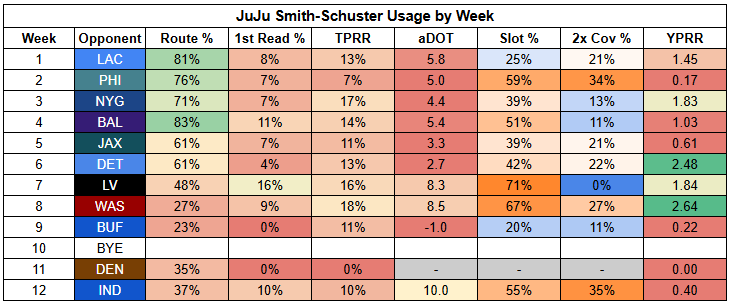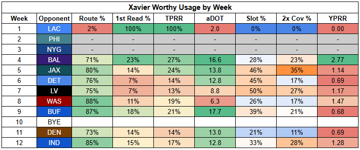 Xavier Worthy has also had issues against man coverage; he has a strong 24% TPRR but just 1.36 YPRR. Unfortunately, he's been even worse against zone, with a 19% TPRR and 1.30 YPRR.