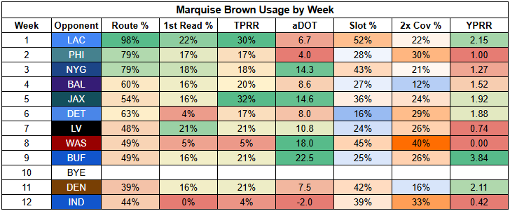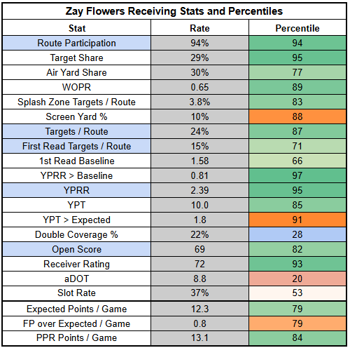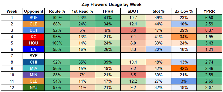 With passing volume somewhat uncertain here, Zay Flowers isn't a totally locked-in play. But he still looks pretty damn strong. Flowers hasn't turned in below 2.00 YPRR since back in Week 6.