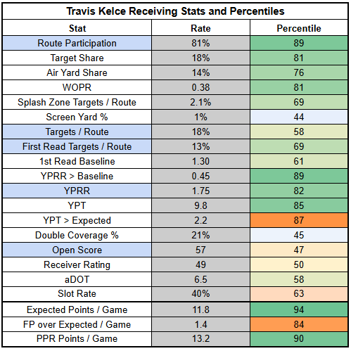 The silver lining is that Kelce has been better against zone than man, with a 20% TPRR and 2.13 YPRR against zone, but just 16% and 1.29 against man. As a bet on Mahomes taking advantage of a weak secondary, Kelce is a high-end TE1.