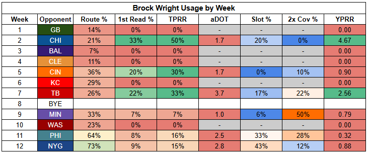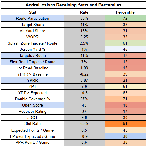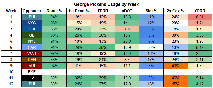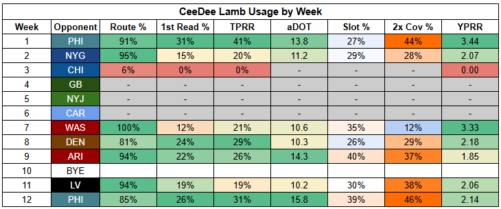 For Rashee Rice, this is pretty ideal. Even when facing double coverage within zone coverage schemes, he has a 21% TPRR with 3.52 YPRR. The Cowboys double cover at a high rate and will focus on limiting Rice as much as possible.