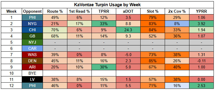 Behind the Cowboys' top two WRs, KaVontae Turpin and Ryan Flournoy are in a split role. Turpin looks slightly more interesting as a bet on some gadget usage.