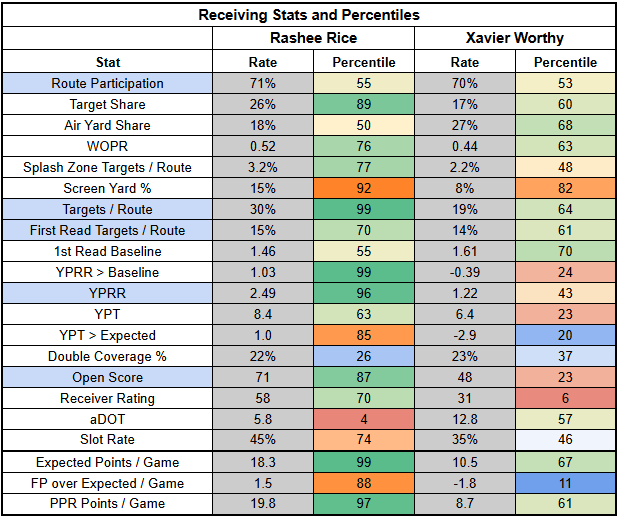 Against man coverage this year, Rice has a 21% TPRR with just 0.90 YPRR. But against zone, Rice has a 32% TPRR with 3.44 YPRR.