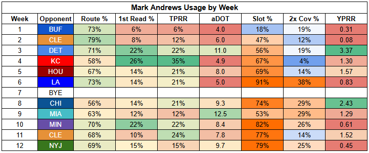 Mark Andrews hasn't scored a TD in a couple of weeks, turning in a 3/32/0 receiving line against the Browns and 1/9/0 against the Jets. He's been TD dependent all year, but we're really feeling it now without those TDs hitting our lineups.
