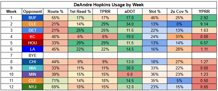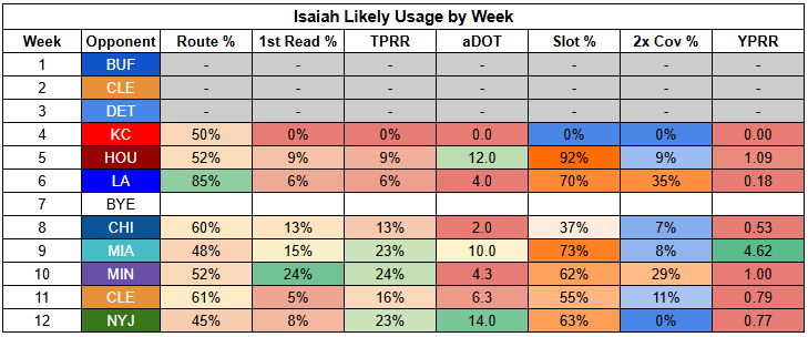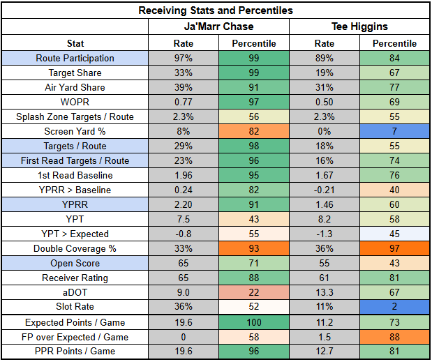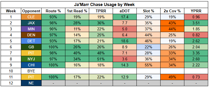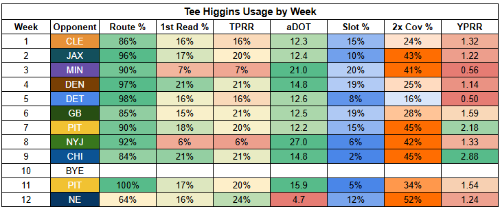 Higgins was in a bit of a different role with Chase out last week, seeing more shallow targets. But with Chase on the field, he has consistently operated as a field stretcher, drawing double coverage as well as targets.