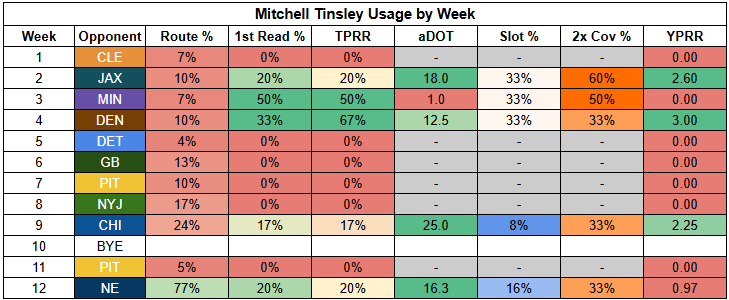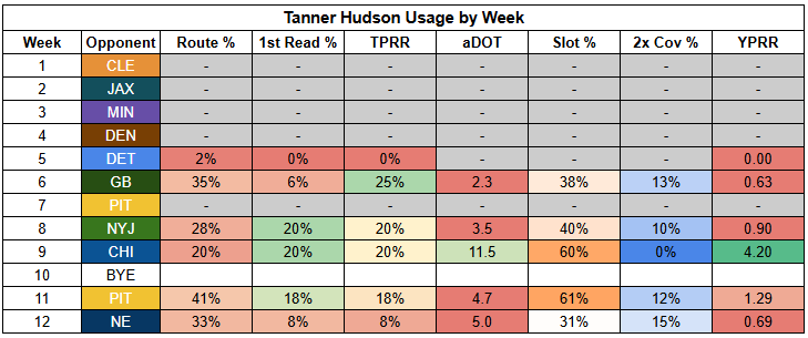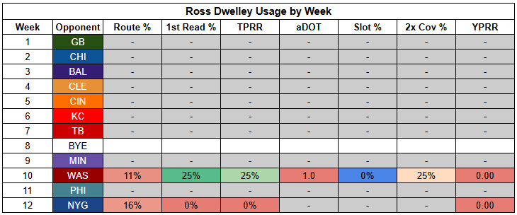 This leaves Ross Dwelley in line to start at tight end. Dwelley has barely played this year, but he's been in the league since 2018, so we at least have some data on him. However, we have to go back to 2022 to find a season with more than one target, and to 2020 to find one with more than five targets.