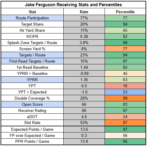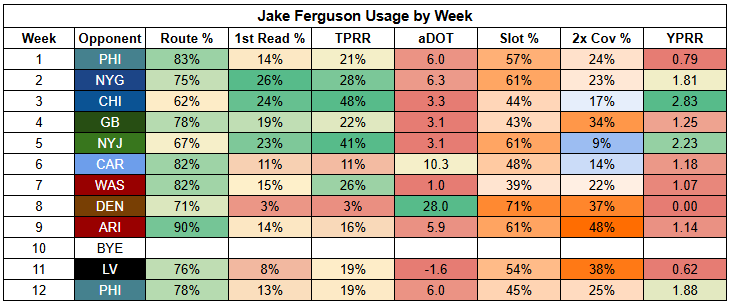 Jake Ferguson will be operating as the true No. 3 option in the passing game. He's been quiet recently, but showed a little life against the Eagles with a 5/60/0 on six targets.