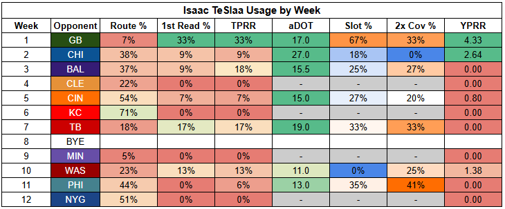 That should cement more routes for Isaac TeSlaa. But while I can promise you more routes for TeSlaa, targets are another thing entirely. TeSlaa is also listed questionable with a hand injury after being limited all week.