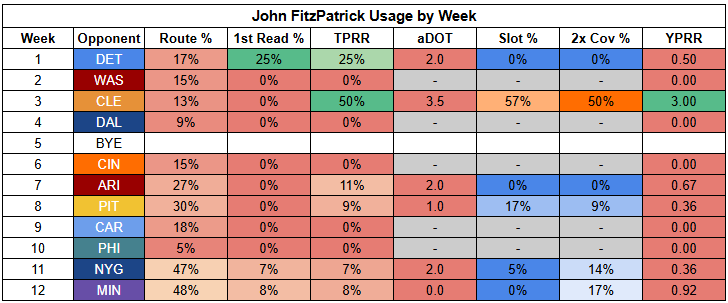 At tight end, the Packers are continuing to deploy a three-way split. If I had to roll out any of these guys, it would be John Fitzpatrick. But I would prefer to avoid doing that.