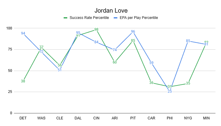 And Love has been extremely efficient this season as a whole, ranking QB3 in EPA per game and QB9 in success rate.